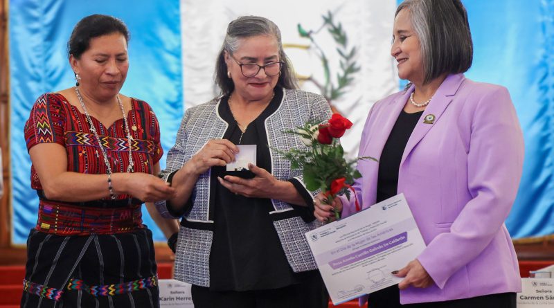 Acompañada por el alcalde Elías Calderón Álvarez y su familia, la primera dama municipal recibió este reconocimiento en la categoría del área rural por su aporte al empoderamiento y desarrollo de la mujer en El Chal.