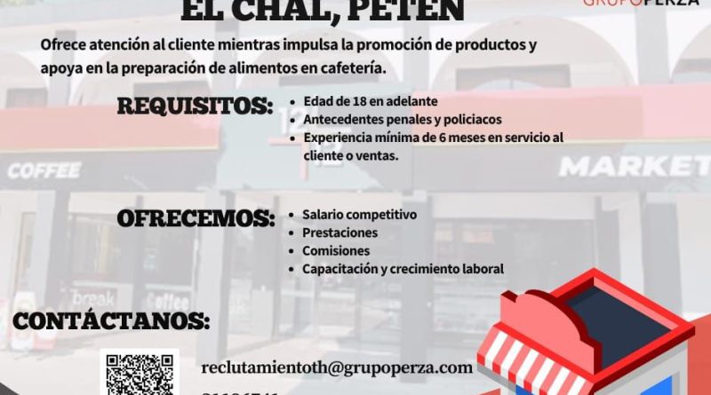 Grupo Perza está contratando Representante de Servicio al Cliente para el Market de su estación Texaco en El Chal, Petén.