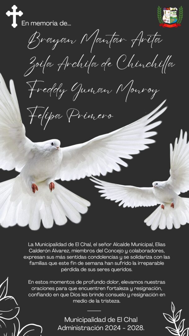La Municipalidad de El Chal, el señor Alcalde Municipal, Elías Calderón Álvarez, miembros del Concejo y colaboradores, expresan sus más sentidas condolencias a las familias que este fin de semana han sufrido la irreparable pérdida de sus seres queridos: