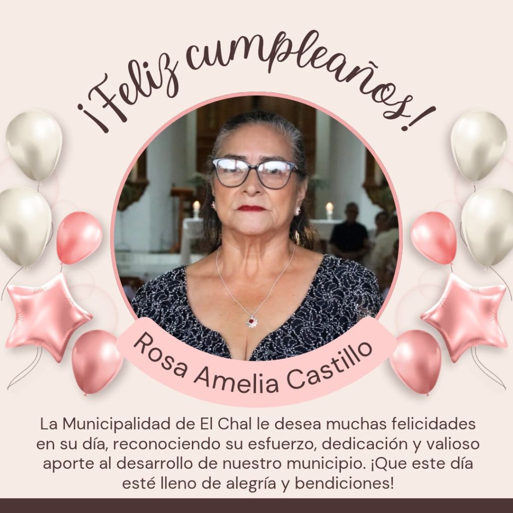 La Municipalidad de El Chal felicita con aprecio a la Primera Dama Municipal en esta fecha especial, reconociendo su destacada trayectoria de servicio, compromiso y amor por el municipio.