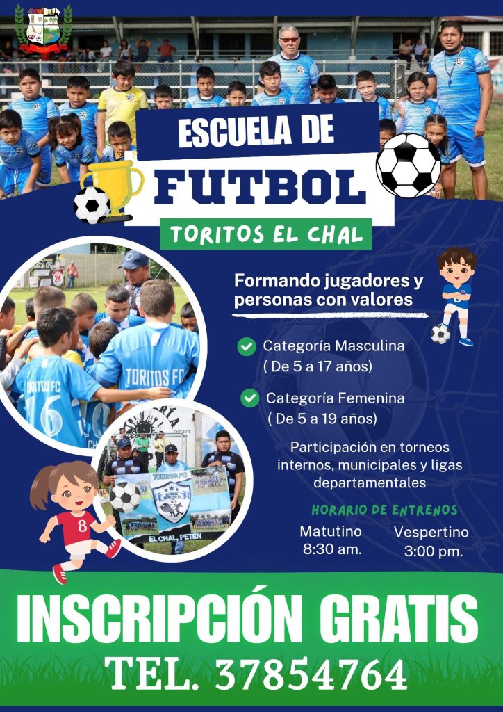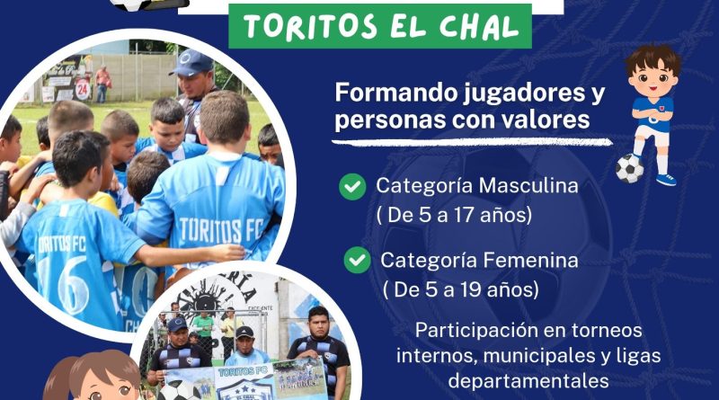 Bajo la Administración del señor Alcalde Municipal, Elías Calderón Álvarez, se ha brindado contrato municipal a los entrenadores de la Escuela de Fútbol Toritos El Chal, permitiendo que la inscripción y los entrenamientos sean completamente GRATUITOS, garantizando así el acceso al deporte para todos los niños y niñas, sin distinción.