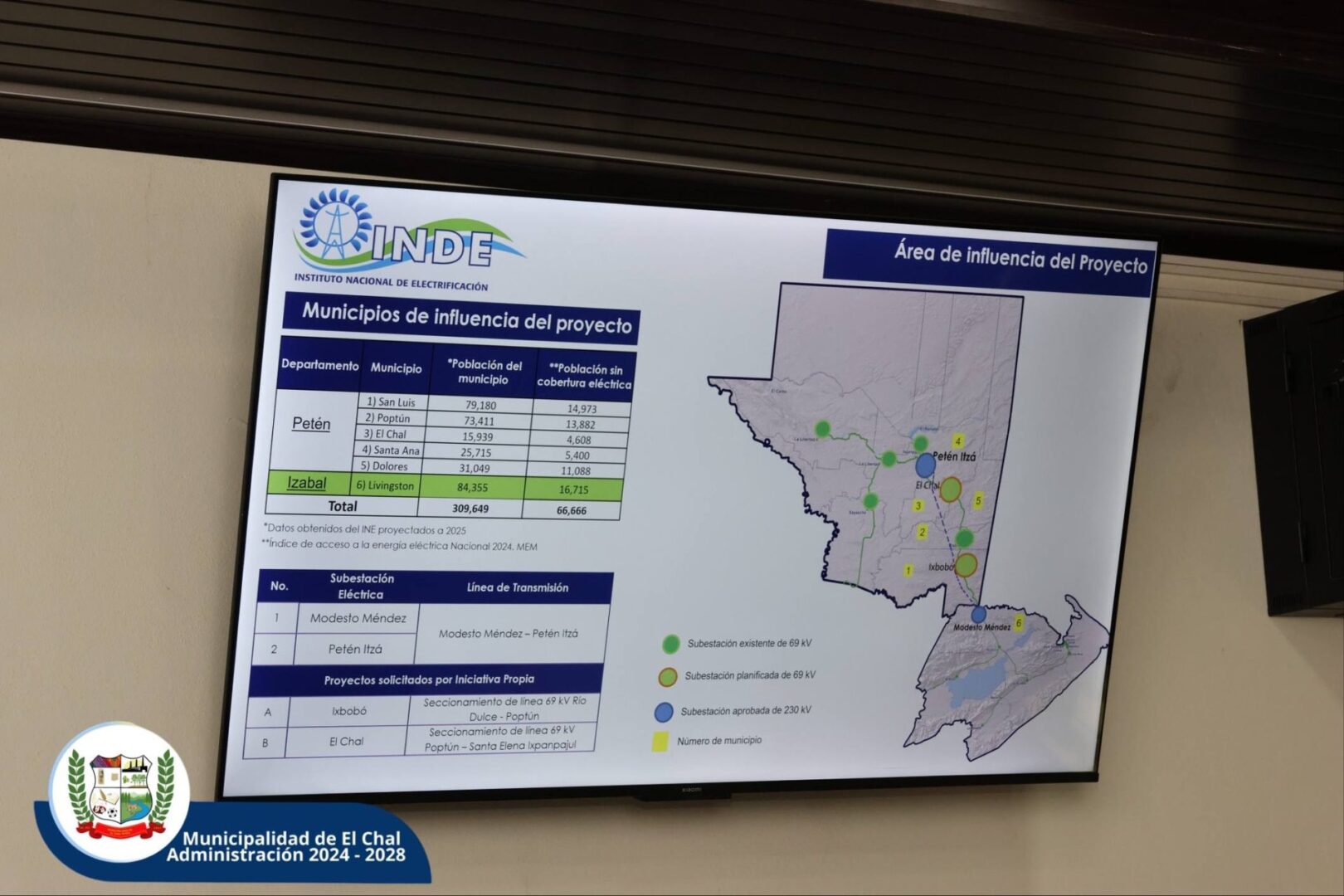 El señor Alcalde Municipal, Elías Calderón Álvarez, recibió en el Despacho Municipal a personal del Instituto Nacional de Electrificación (INDE), en el marco del proyecto “Construcción de la Subestación Eléctrica Petén Itzá y Línea de Transmisión Asociada, Petén”.