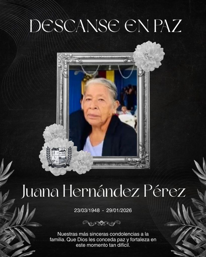 Con profundo dolor y respeto lamentamos el sensible fallecimiento de la señora: Juana Hernández Pérez, quien hoy parte a la presencia del Señor, dejando un vacío irreparable en el corazón de su familia y de todos quienes tuvieron el privilegio de conocerla.