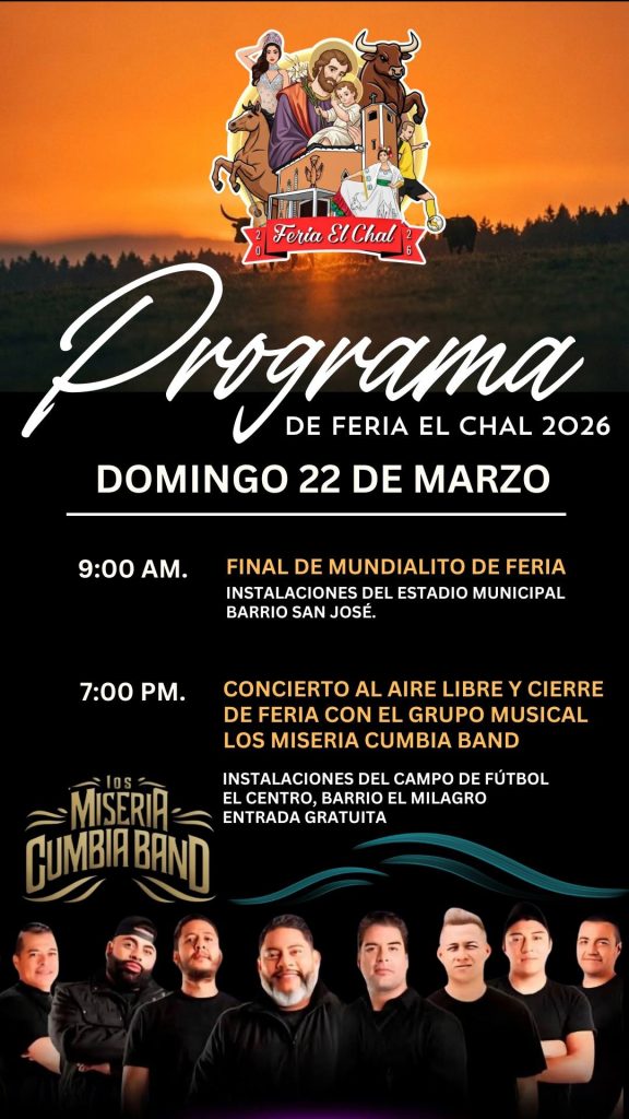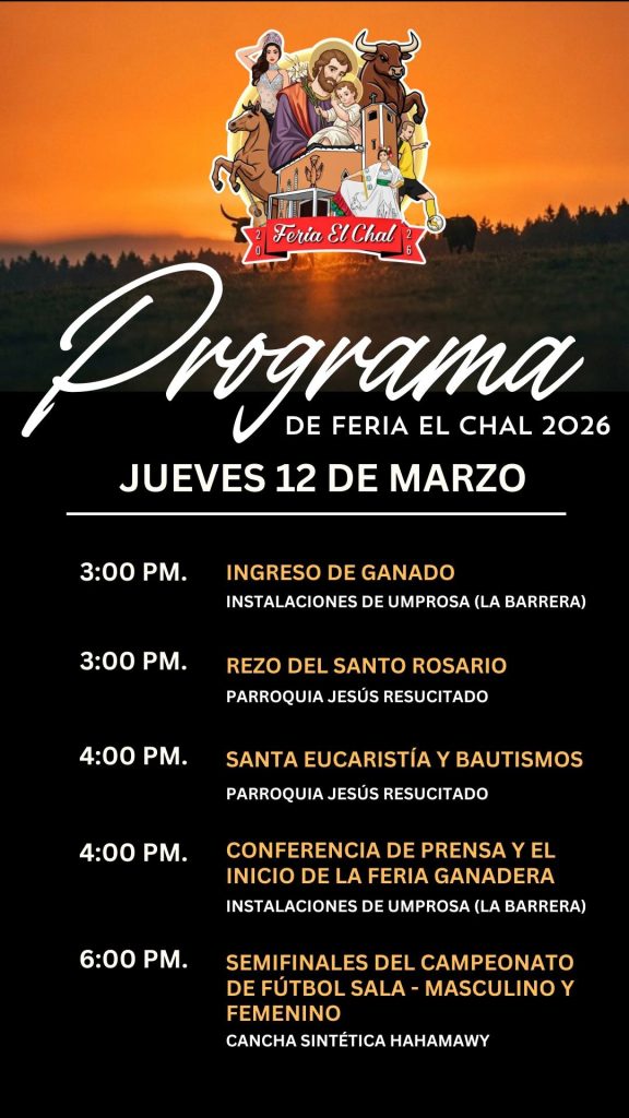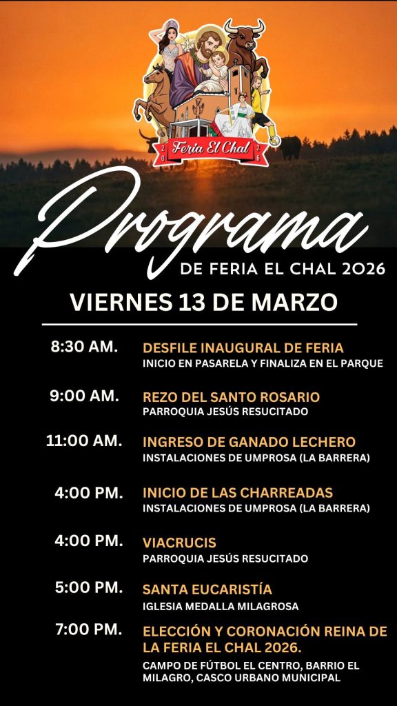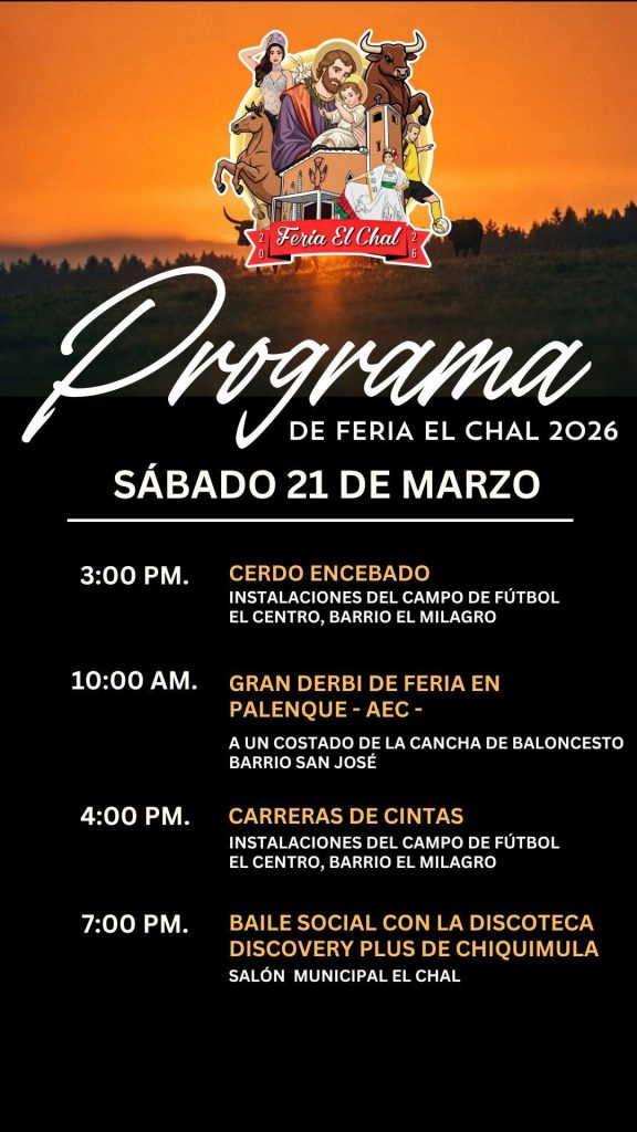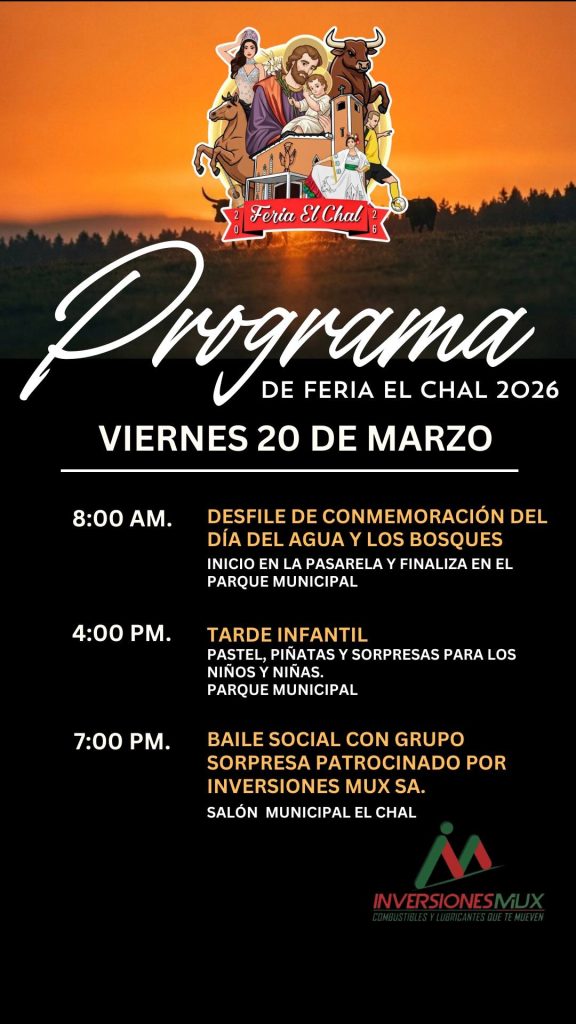 El señor Alcalde Municipal, Elías Calderón Álvarez y el Comité de Feria, tienen el honor de invitar a toda la población chalence y visitantes de municipios vecinos a disfrutar de las actividades de la Feria Patronal y Ganadera de nuestro querido municipio de El Chal.