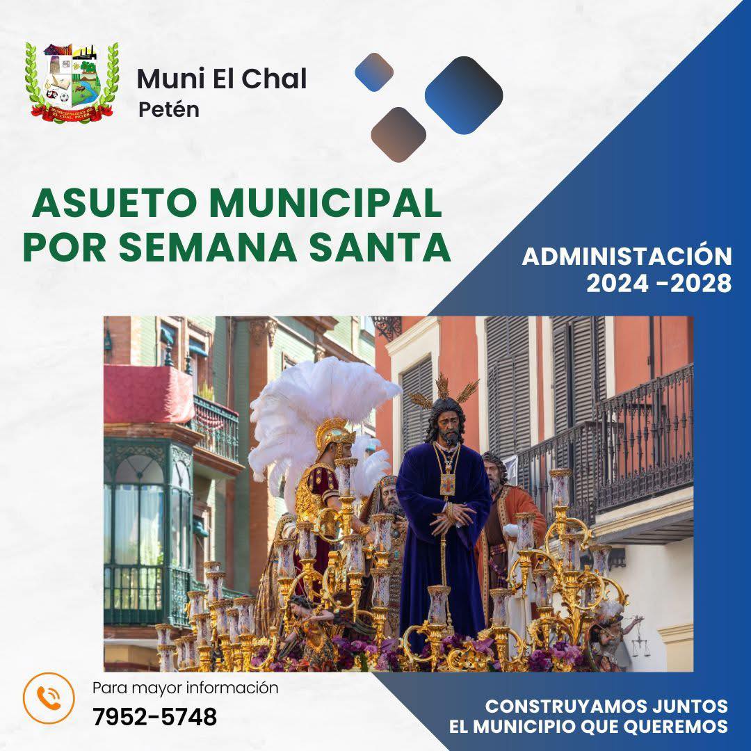 La Municipalidad de El Chal informa a la población en general que, con motivo del asueto de Semana Santa, el edificio municipal permanecerá cerrado del lunes 30 de marzo al viernes 3 de abril, reanudando labores el lunes 6 de abril del presente año en su horario habitual, de 8:00 am. a 4:00 pm.